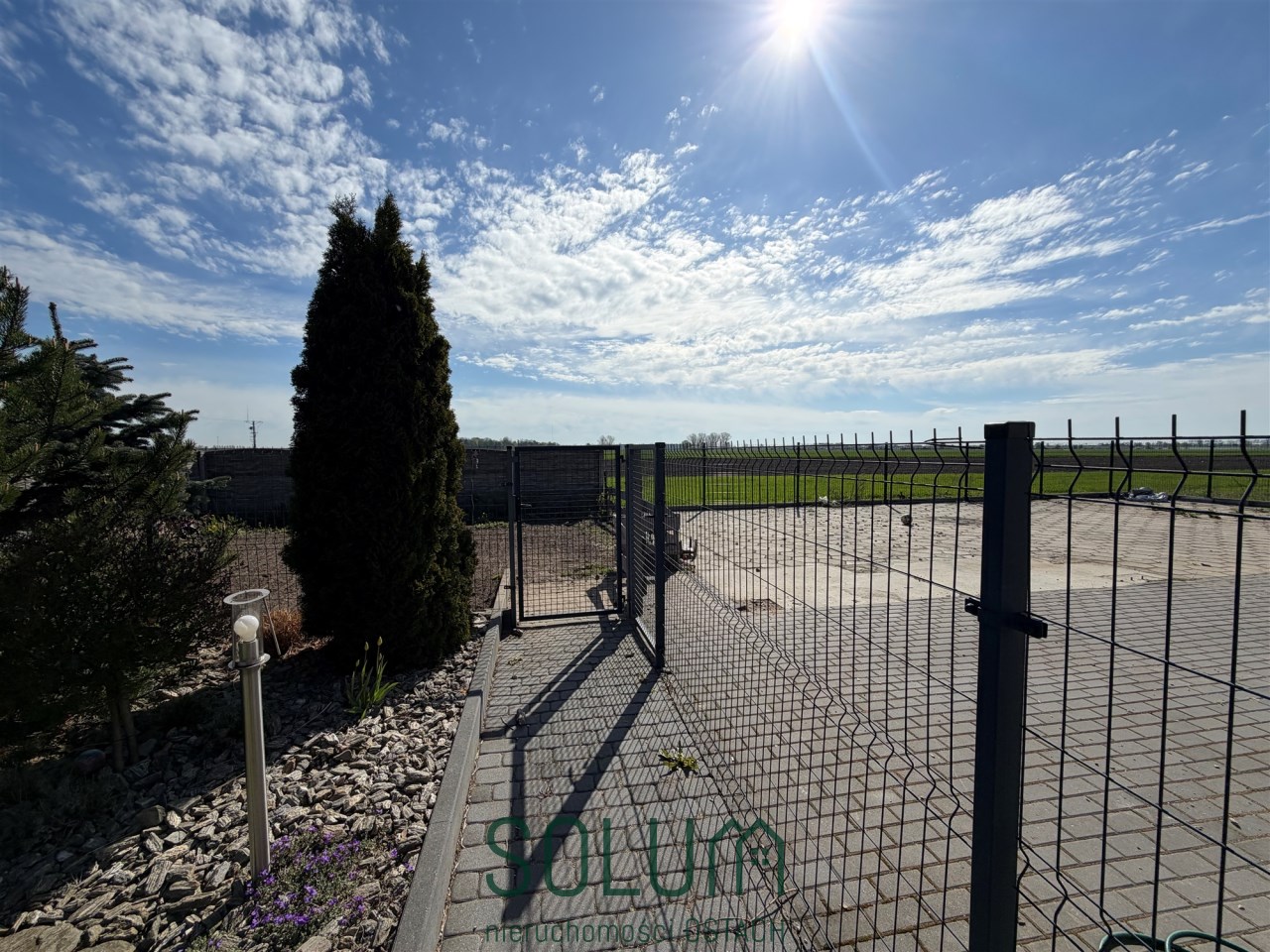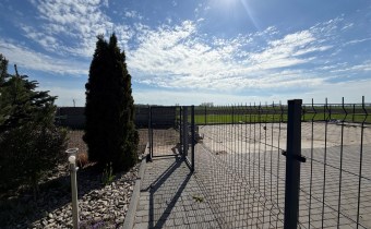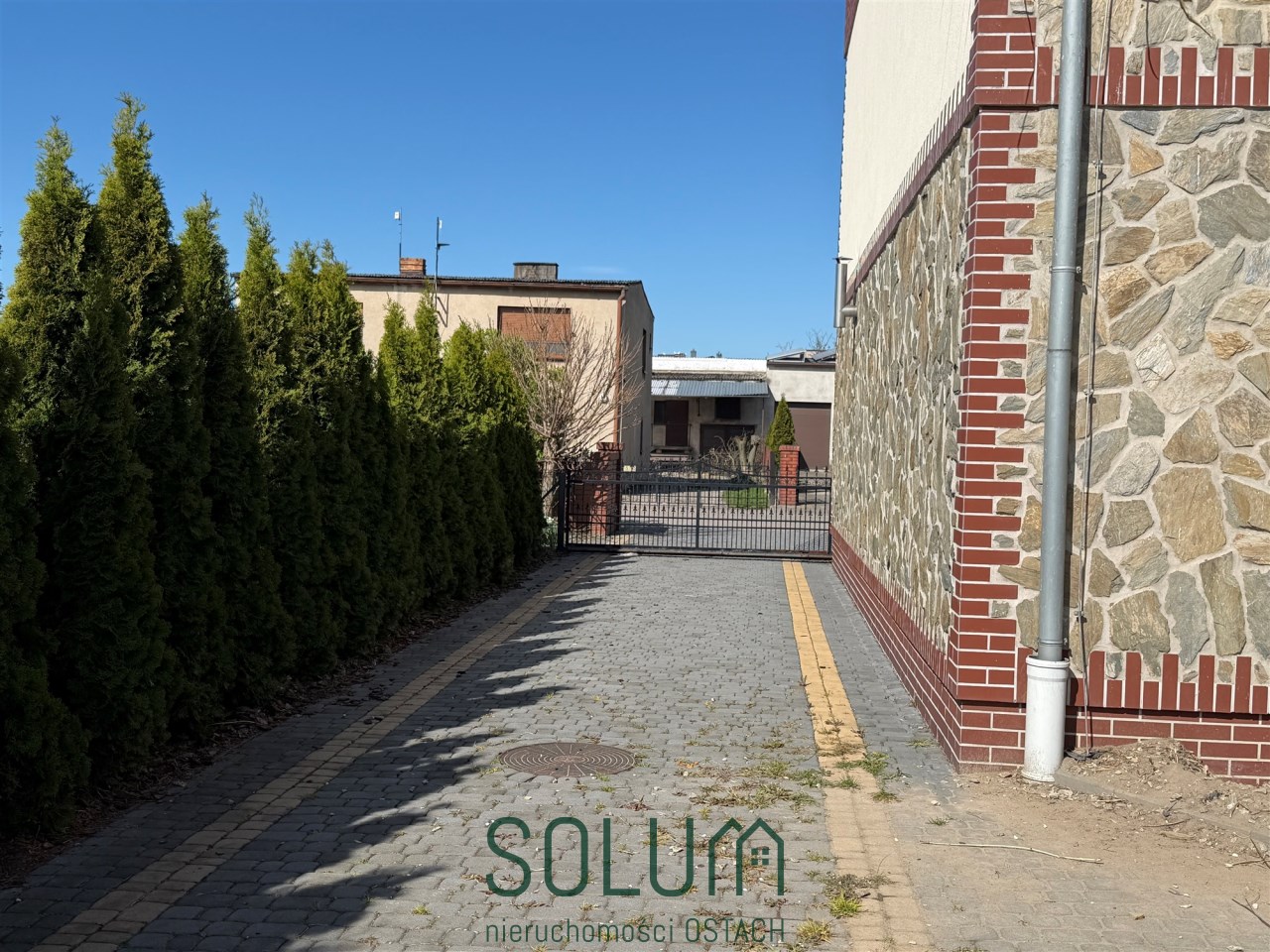 Teren ogrodzony - od frontu murowany płot z kamienia i klinkieru z kutymi panelami, pozostała część z paneli metalowych,