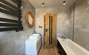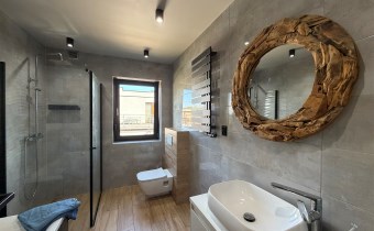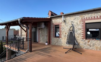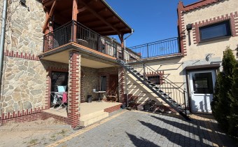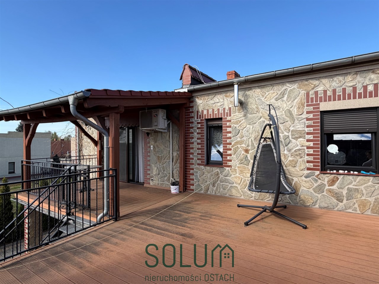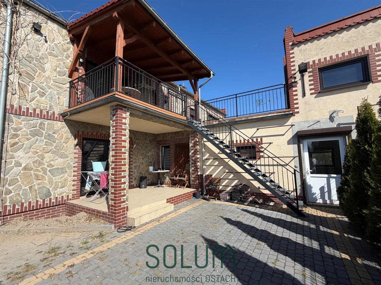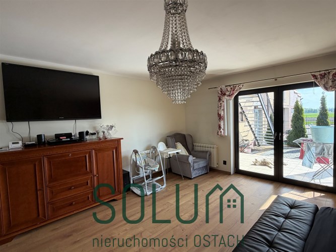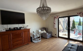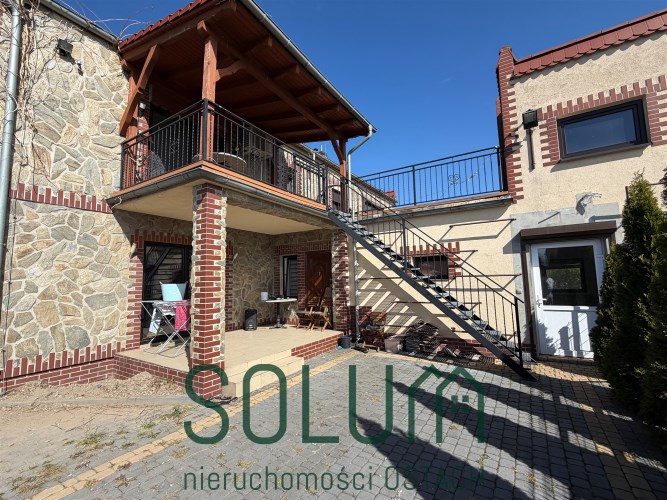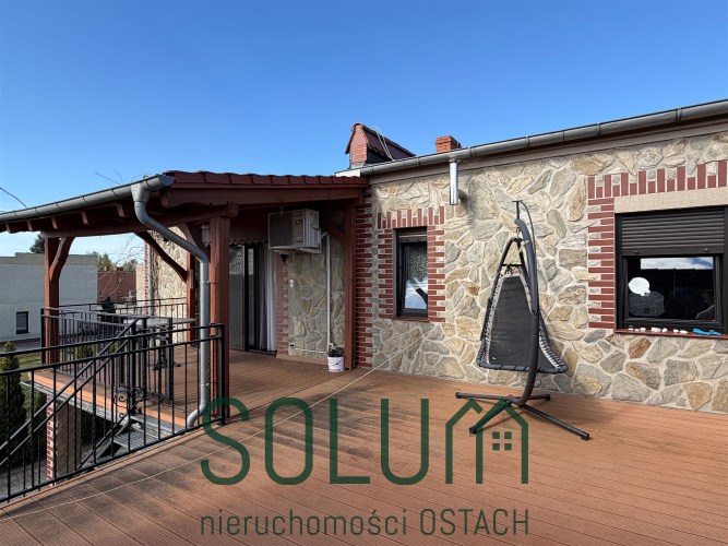Ogromnym atutem jest bardzo duży klimatyczny, częściowo zadaszony taras z wejściami do kilku pomieszczeń znajdujących się na piętrze oraz schodami zewnętrznymi prowadzącymi do części gospodarczej.