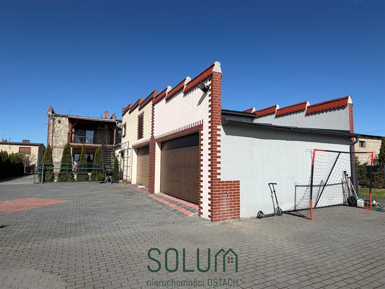 Na zapleczu budynku głównego znajduje się murowany budynek gospodarczy o powierzchni 129 m2, składający się z dwóch dużych garaży oraz pomieszczenia socjalno-biurowego z dwoma niezależnymi wejściami oraz dojściem z ulicy, co czyni go idealnym do prowadzenia działalności gospodarczej. Jako jedna całość lub osobno część garażowo magazynowa i osobno biuro, gabinet itp.