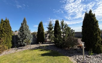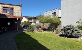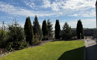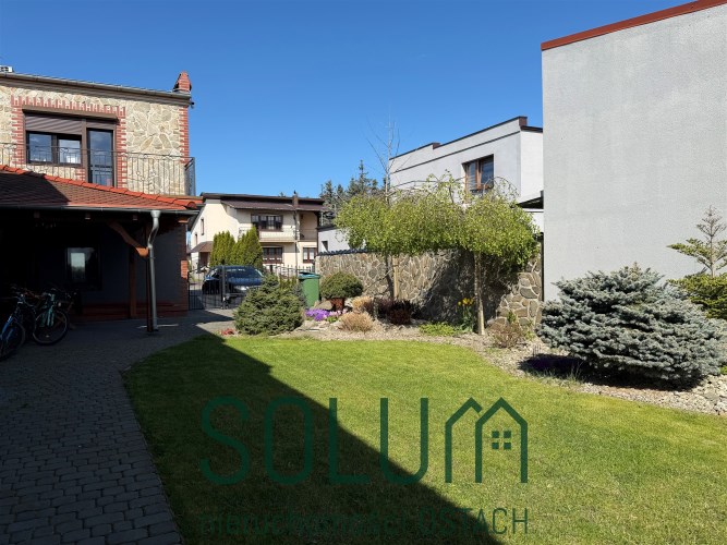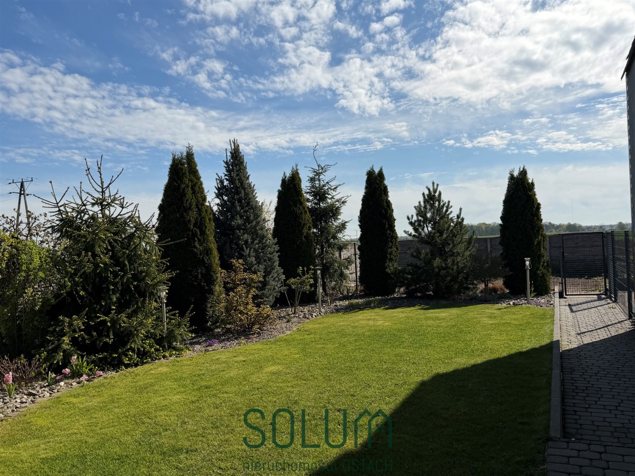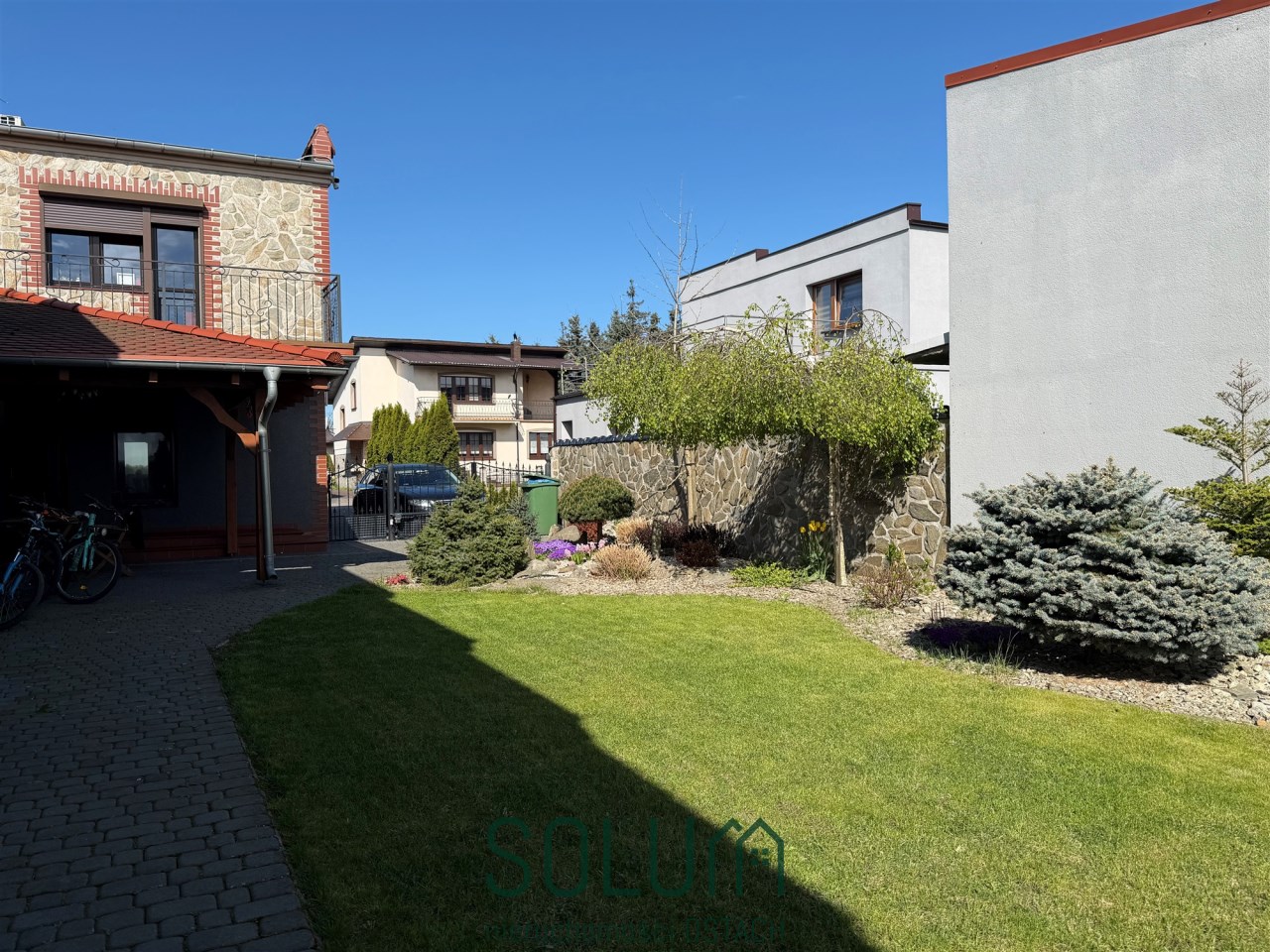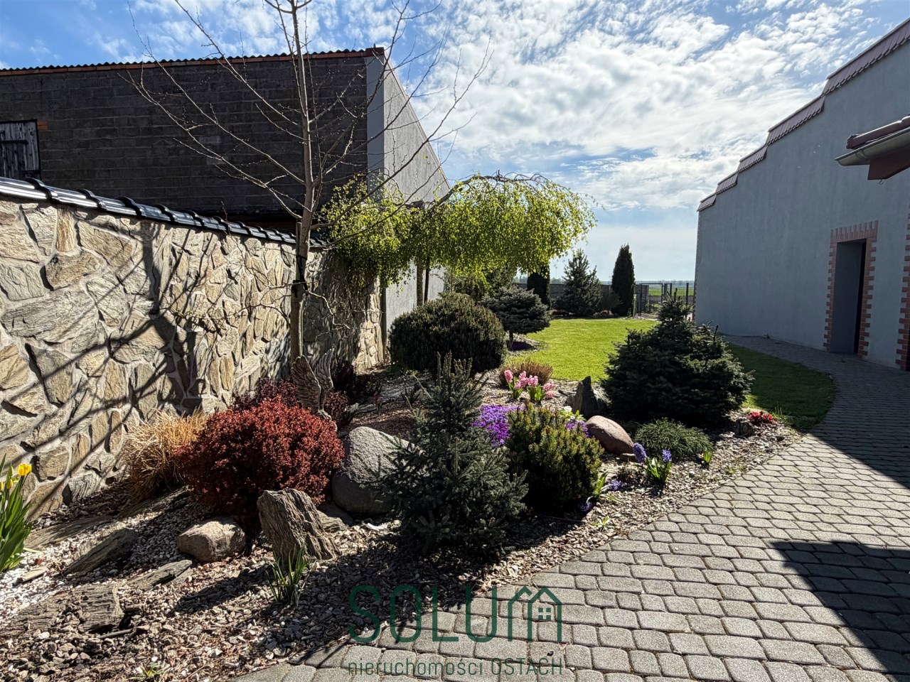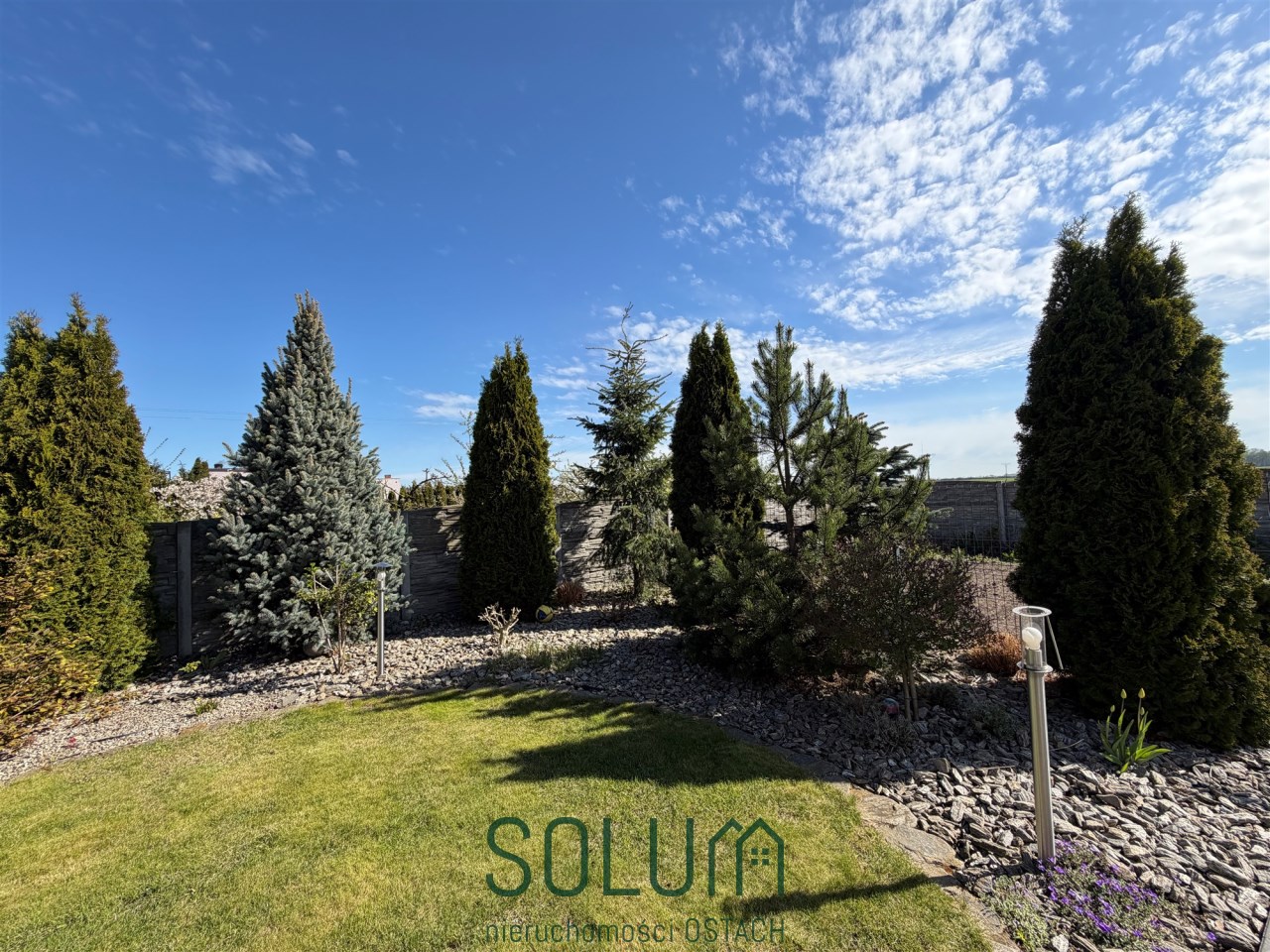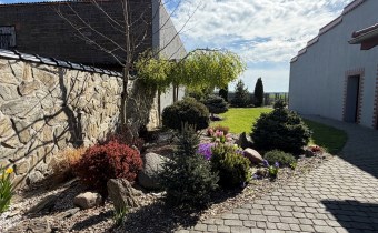 Działka podzielona jest na część zieloną z trawnikiem i ogródkiem, do którego prowadzi osobne wyjściem z budynku mieszkalnego.