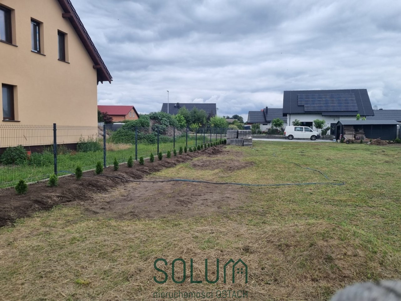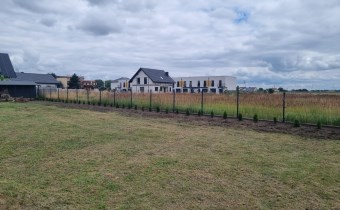 Działka jest w całości ogrodzona płotem z paneli metalowych oraz obsadzona tujami.