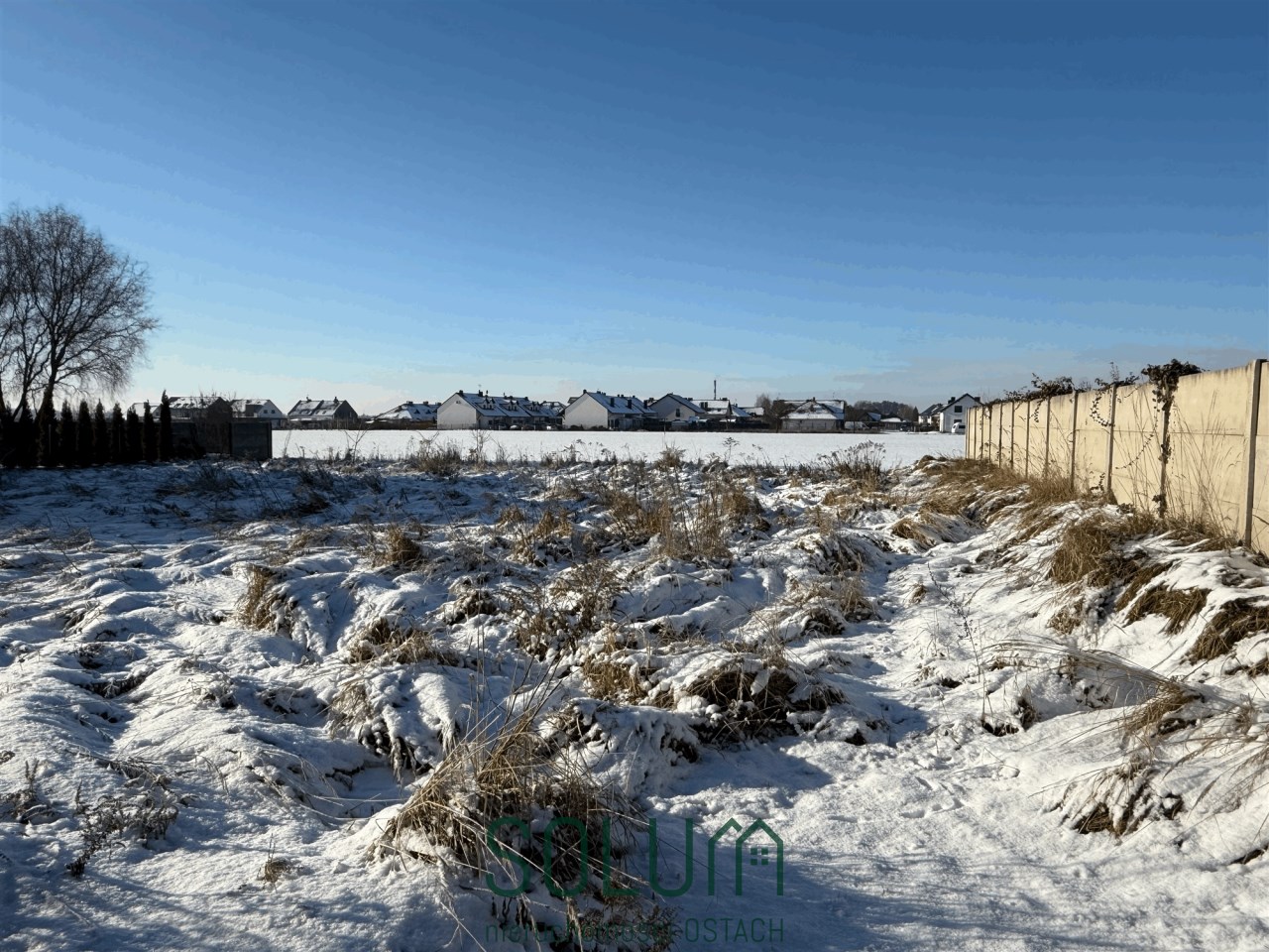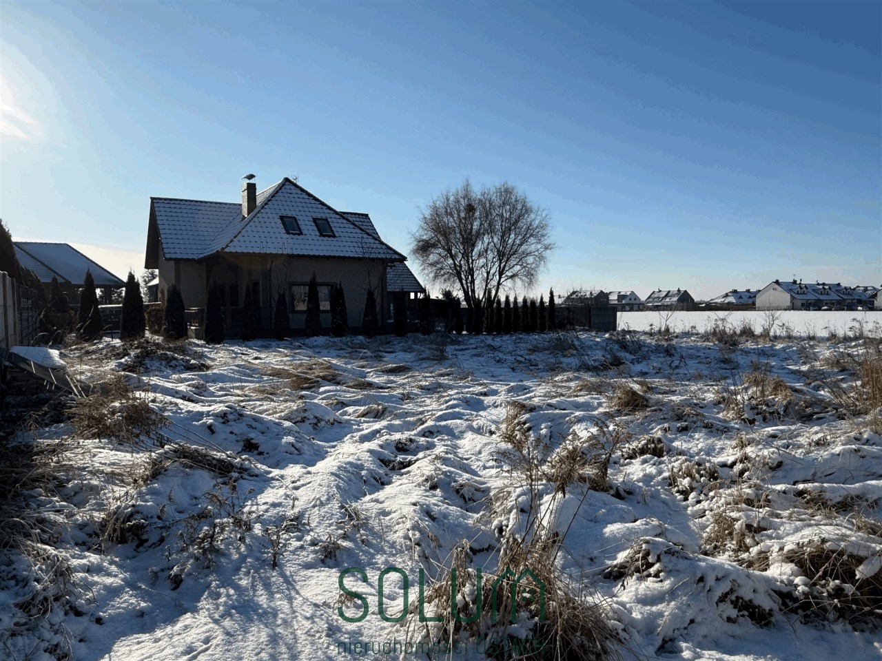 Sąsiednie działki są już zabudowane, co ułatwia zaprojektowanie budynku z optymalnym układem i zachowaniem prywatności.