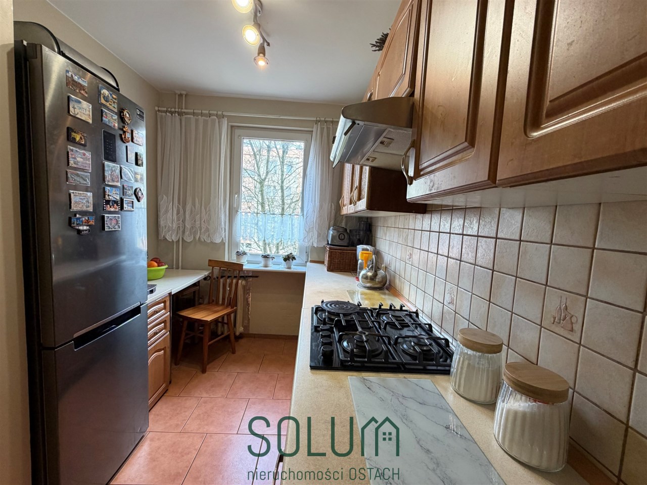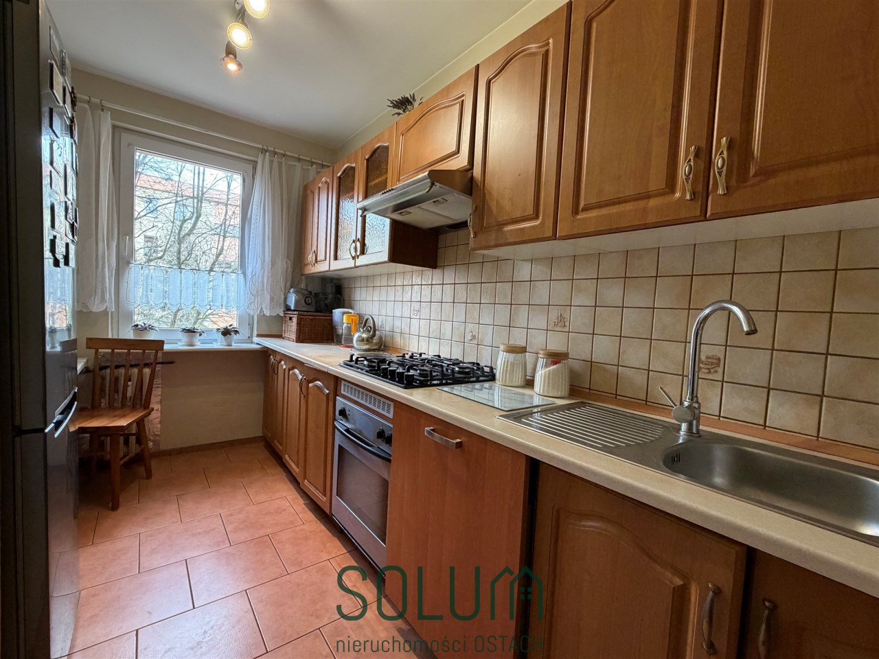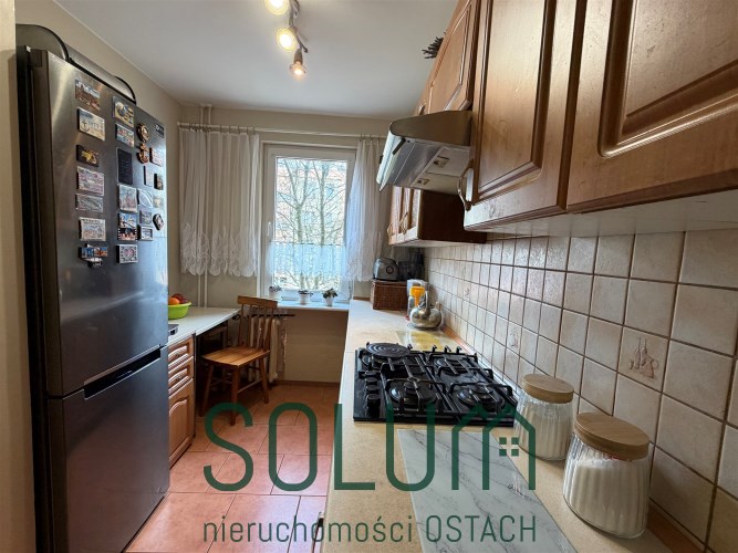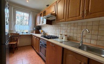 Mieszkanie wyposażone jest w zabudowę kuchenną wraz ze sprzętem AGD (kuchenka gazowa z piekarnikiem, lodówka, okap). Szafę typu Komandor w przedpokoju.