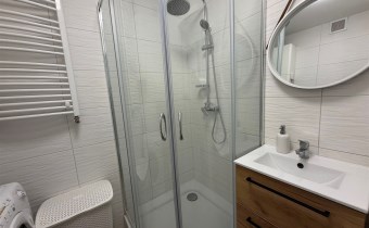 - Łazienka z kabina prysznicową, szafką podumywalkową i pralką.