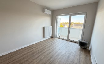 Przestronny salon z aneksem kuchennym i wyjściem na duży balkon,
