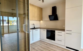 Przestronny salon z aneksem kuchennym i wyjściem na duży balkon,