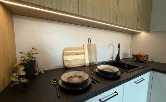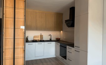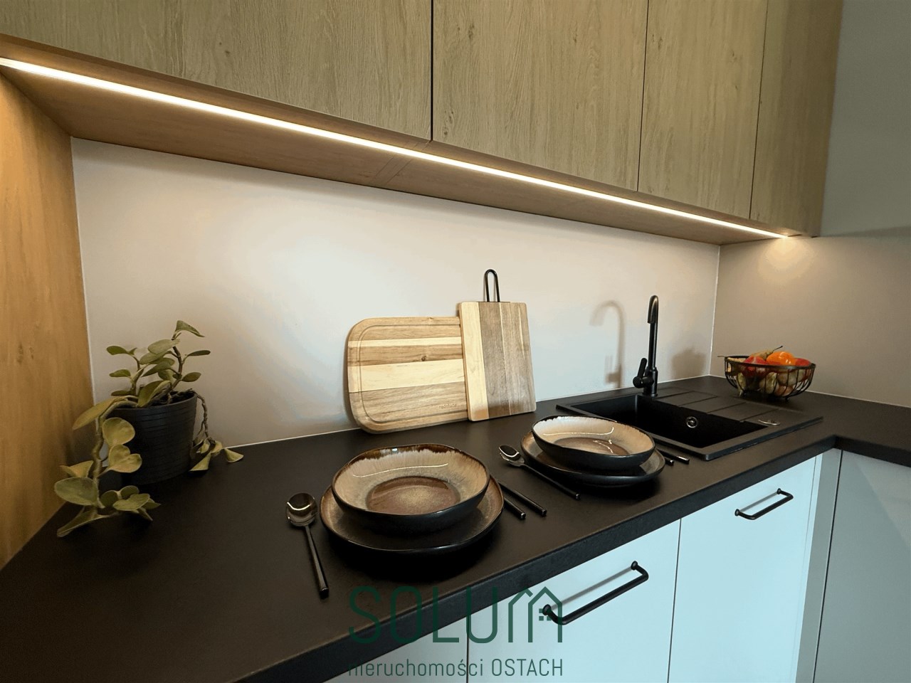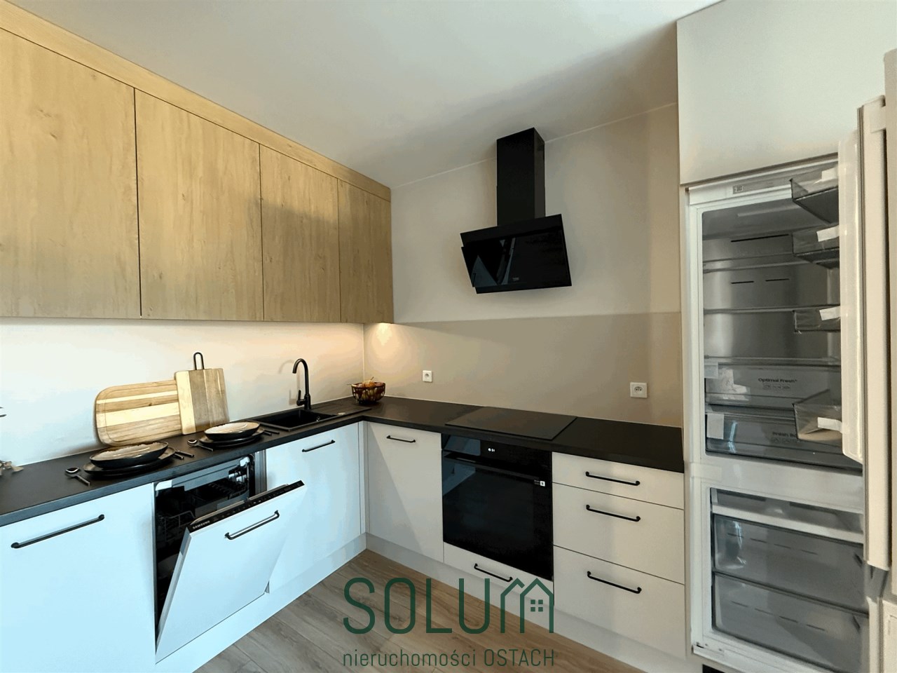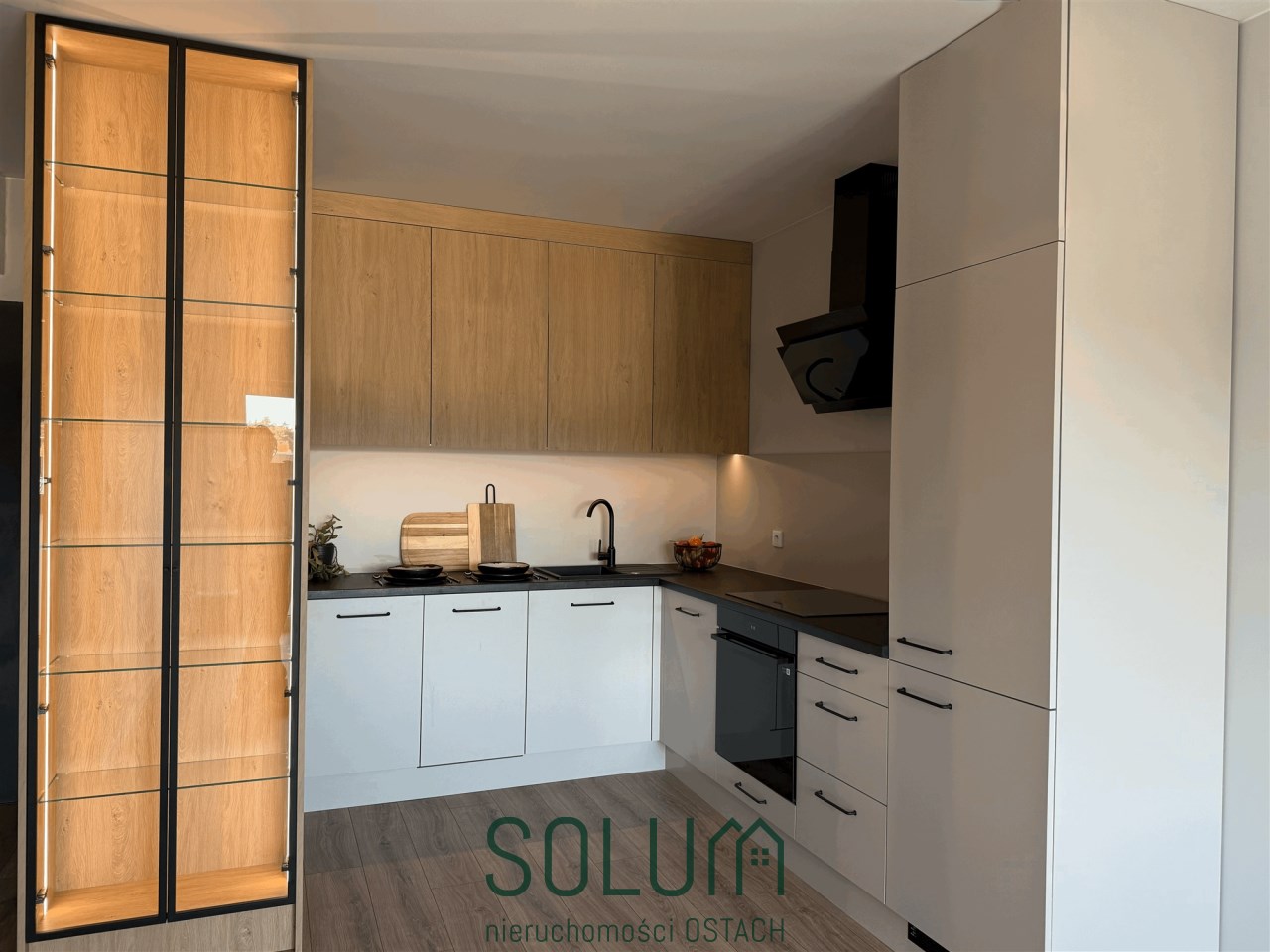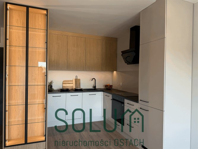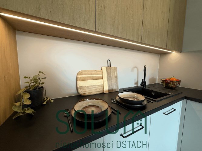 W cenie pozostaje zabudowa kuchenna wykonana przez stolarza w modnym połączeniu kaszmiru i ciepłego drewna, wraz ze sprzętem AGD firmy Samsung (płyta indukcyjna, piekarnik, zmywarka, duża lodówka oraz okap), duża podświetlana, przeszklona szafa, w przedpokoju pojemna szafa.
