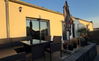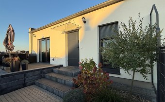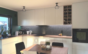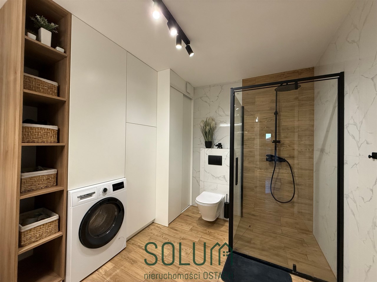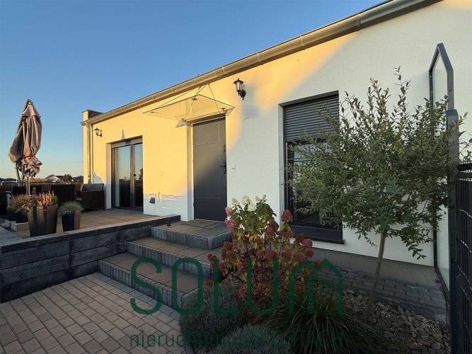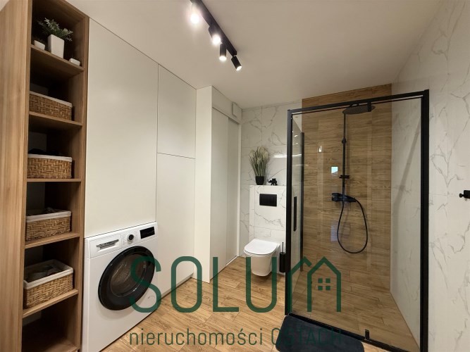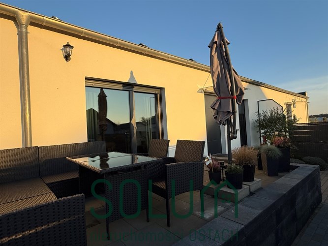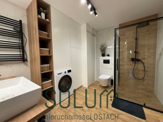 Standard: - okna: trzyszybowe, rolety elektryczne sterowane przez aplikację; - dach: papa termozgrzewalna; - ściany: malowane, płytka; podłogi: panele, terakota; - ogrzewanie: pompa ciepła z zasobnikiem na wodę 180 l, w całym lokalu rozprowadzone ogrzewanie podłogowe;